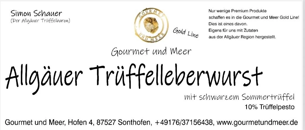 Es ist uns eine Ehre diese premium Leberwurst mit unseren edlen Trüffeln zu verfeinern! Die Empfehlung für jede Brotzeit und nur bei uns erhältlich. An guten Appetit wünscht Simon Schauer (Der Trüffel Baron des Allgäus)