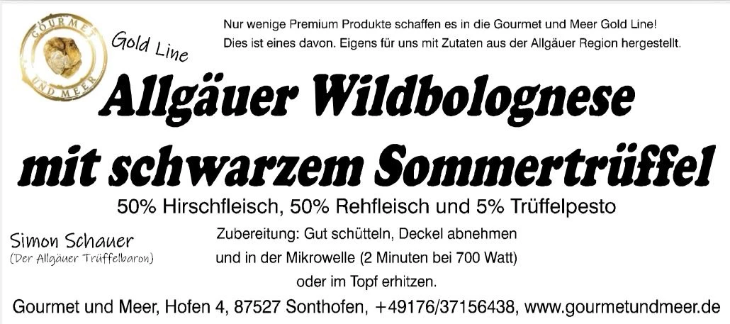 Wir wären nicht Gourmet und Meer, wenn wir nicht auch eigene Kreationen für euch anbieten würden! Hiermit präsentieren wir euch die erste Allgäuer Trüffel Wild Bolognese der extra Klasse!!!